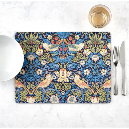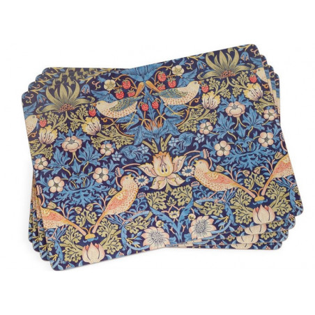 Zestaw czterech wyrafinowanych i praktycznych podkładek korkowych, ozdobionych pięknym, bogatym wzorem przedstawiającym szpaki w truskawkach na niebieskim tle z dziedzictwa wybitnego XIX-wiecznego projektanta Williama Morrisa.