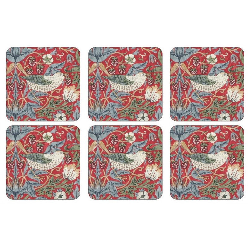 Zestaw sześciu wyrafinowanych i praktycznych podkładek korkowych, ozdobionych pięknym, bogatym wzorem przedstawiającym szpaki w truskawkach na czerwonym tle z dziedzictwa wybitnego XIX-wiecznego projektanta Williama Morrisa.